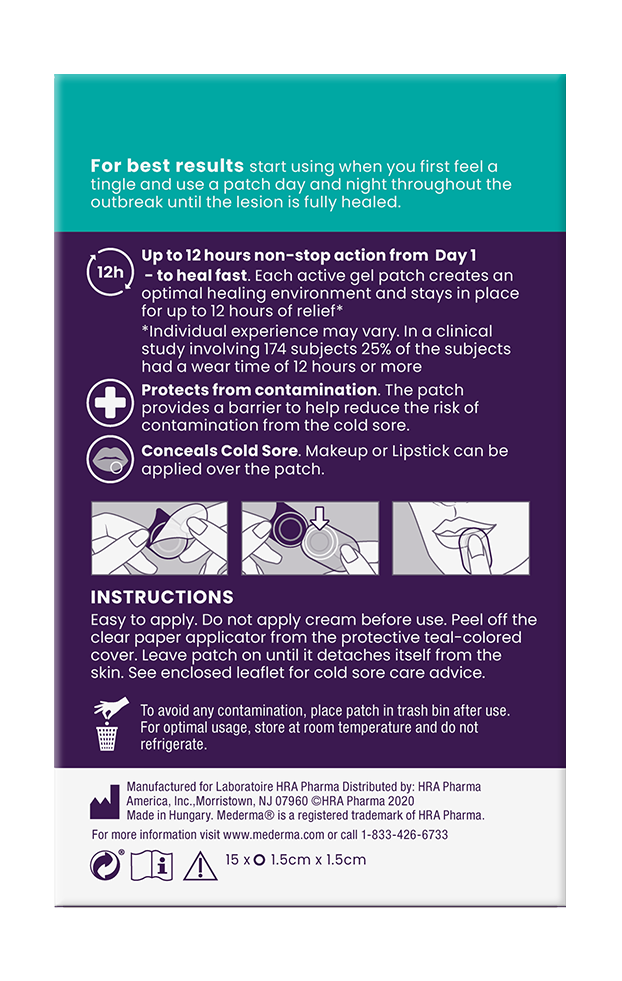 Mederma Cold Sore Patches not only cover up cold sores, they help them to heal. Hydrocolloid gel technology creates a moist environment that can help reduce scab formation to heal cold sores faster.
